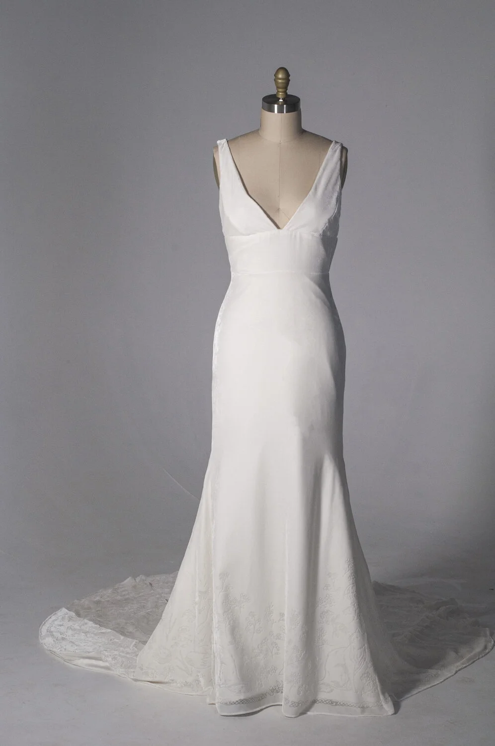 With a soft organic cotton sateen lining, a touch of silk organza, and finished with the luxurious feel of devoré velvet, this dress is unlike any common ready-to-order gown on the market.