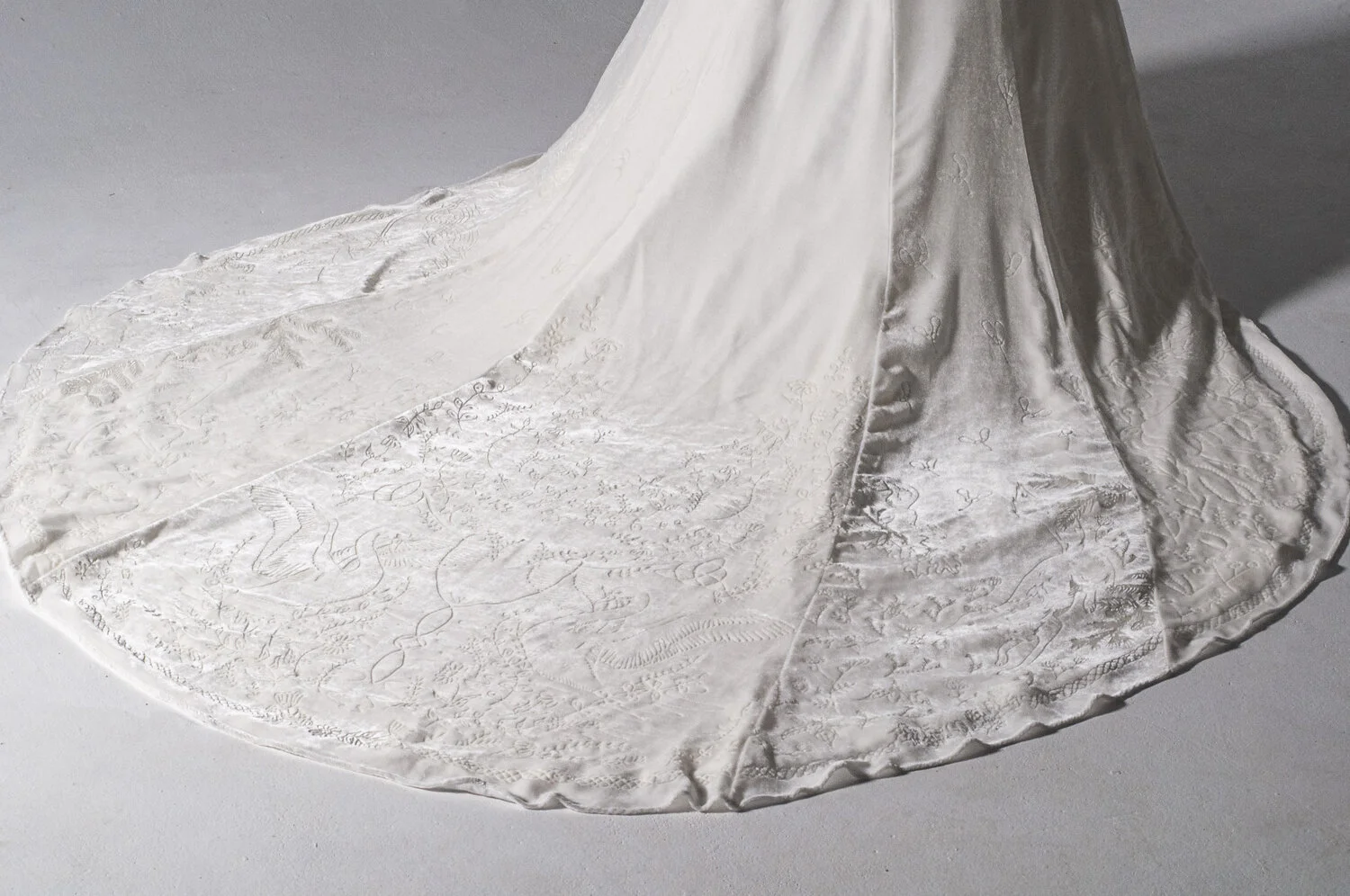 This wedding dress is a powerful and symbolic piece of iconography, used to express one’s love and individuality. Crafted by hand, this gown brings sentimentality and old traditions to life, forming a new heirloom for future generations.