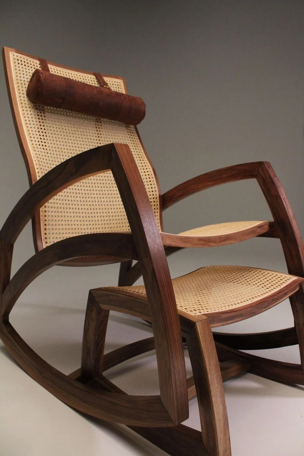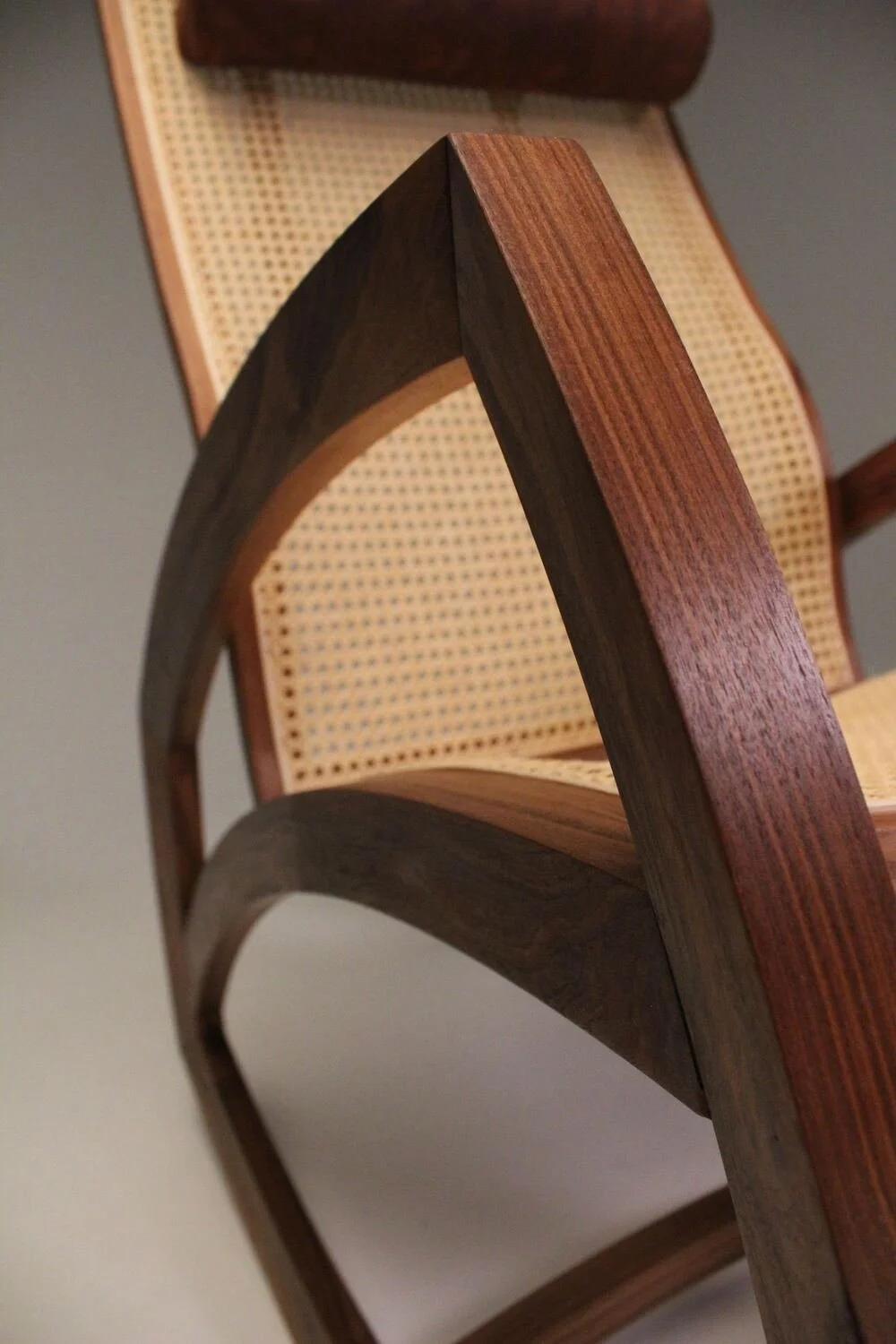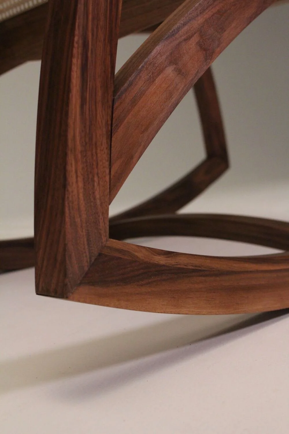 With the exception of the sides of the back frame all elements of the rocker were made of curved parts sharing the same 42” radius. These shared elements bring a visual cohesiveness to the rocker. Cane was chosen for the seat and back as it is light and cool while being firm enough to be supportive yet flexible enough to conform to the compound curves of the rocker.