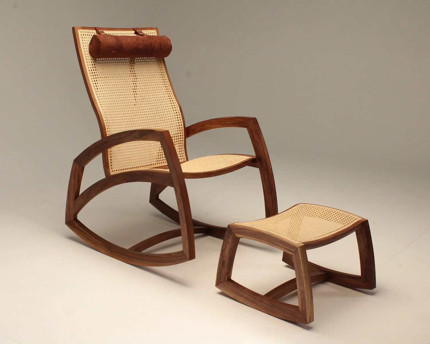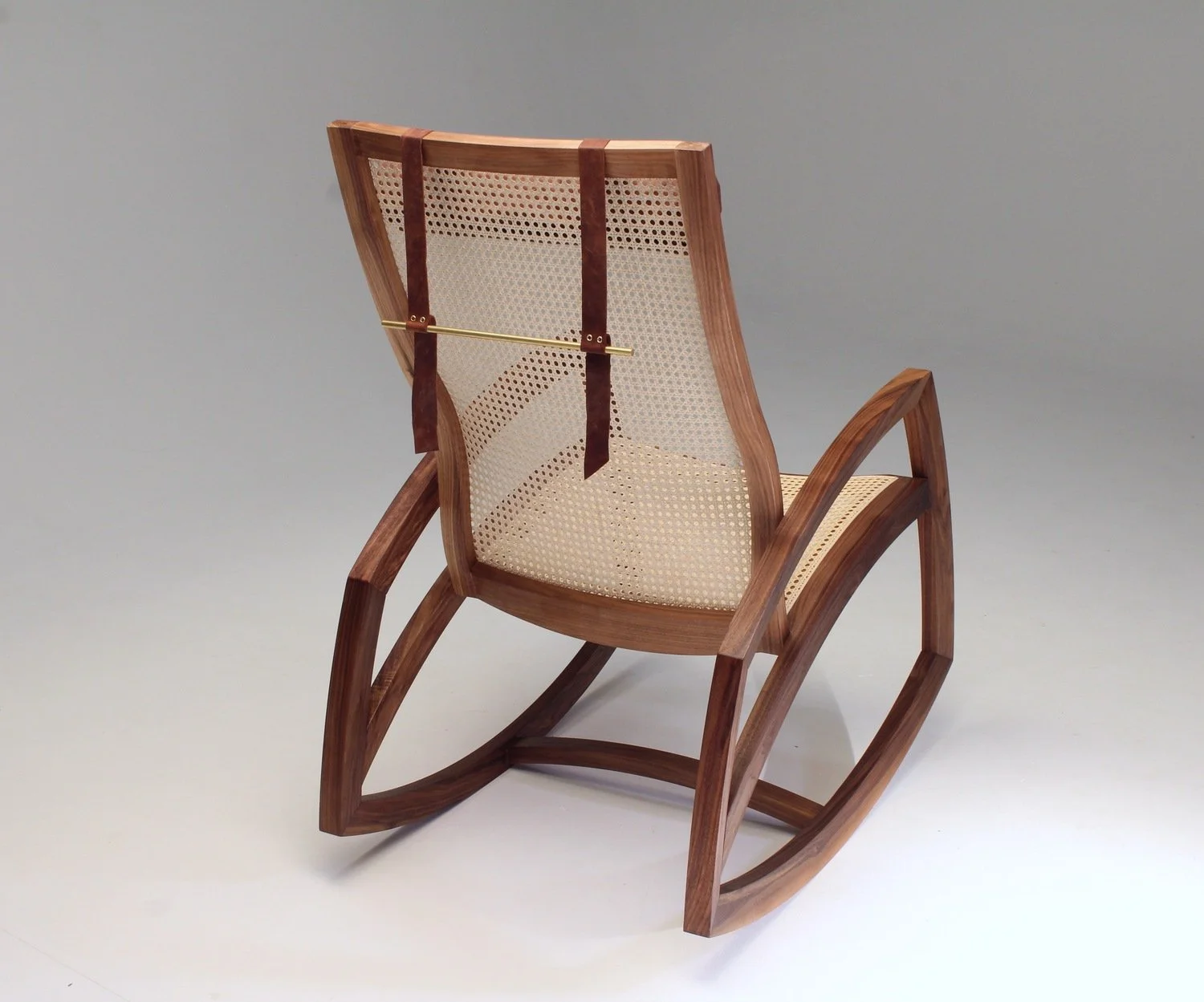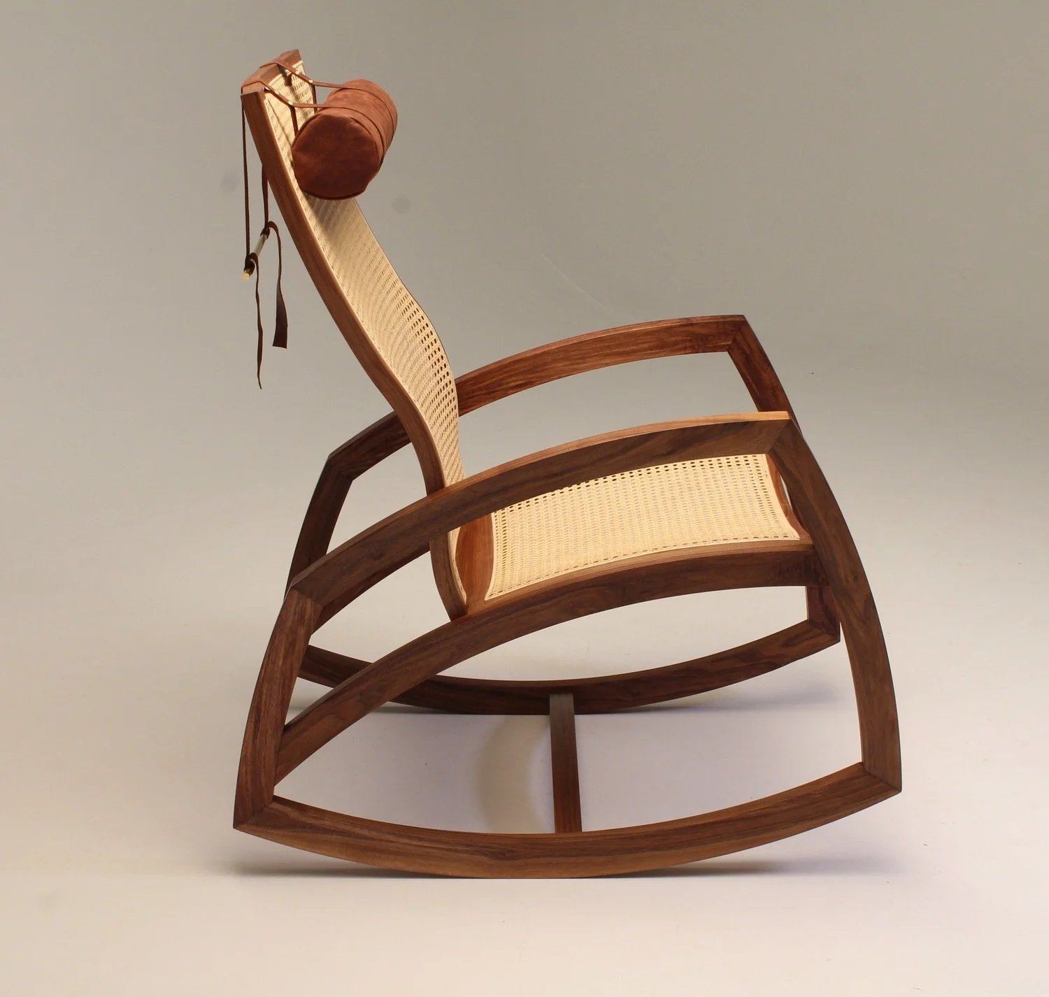 With the exception of the sides of the back frame all elements of the rocker were made of curved parts sharing the same 42” radius. These shared elements bring a visual cohesiveness to the rocker. Cane was chosen for the seat and back as it is light and cool while being firm enough to be supportive yet flexible enough to conform to the compound curves of the rocker.
