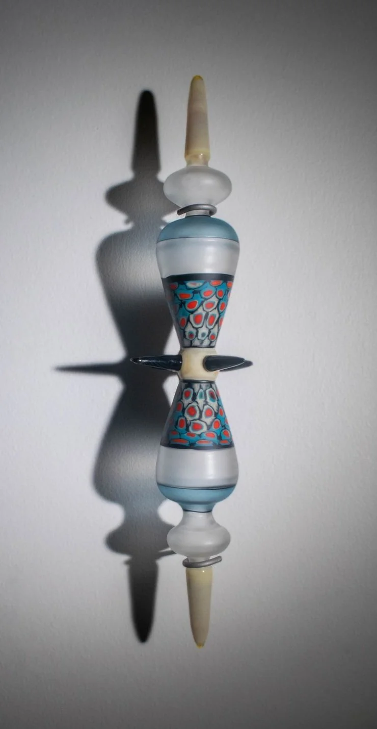 The “patterning instinct” explores the subconscious drive to impose order on chaos. Using murrini and cane techniques in flameworked glass, Aiden creates sculptural and vessel forms that emphasize repetition, symmetry, and balance. Each piece is carefully assembled and shaped on a lathe to preserve geometric clarity and reduce distortion. The result is a body of work that reflects the desire for structure through methodical patternmaking, where every element of the process informs the final structure.