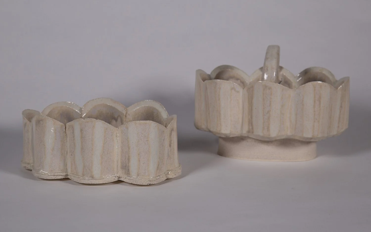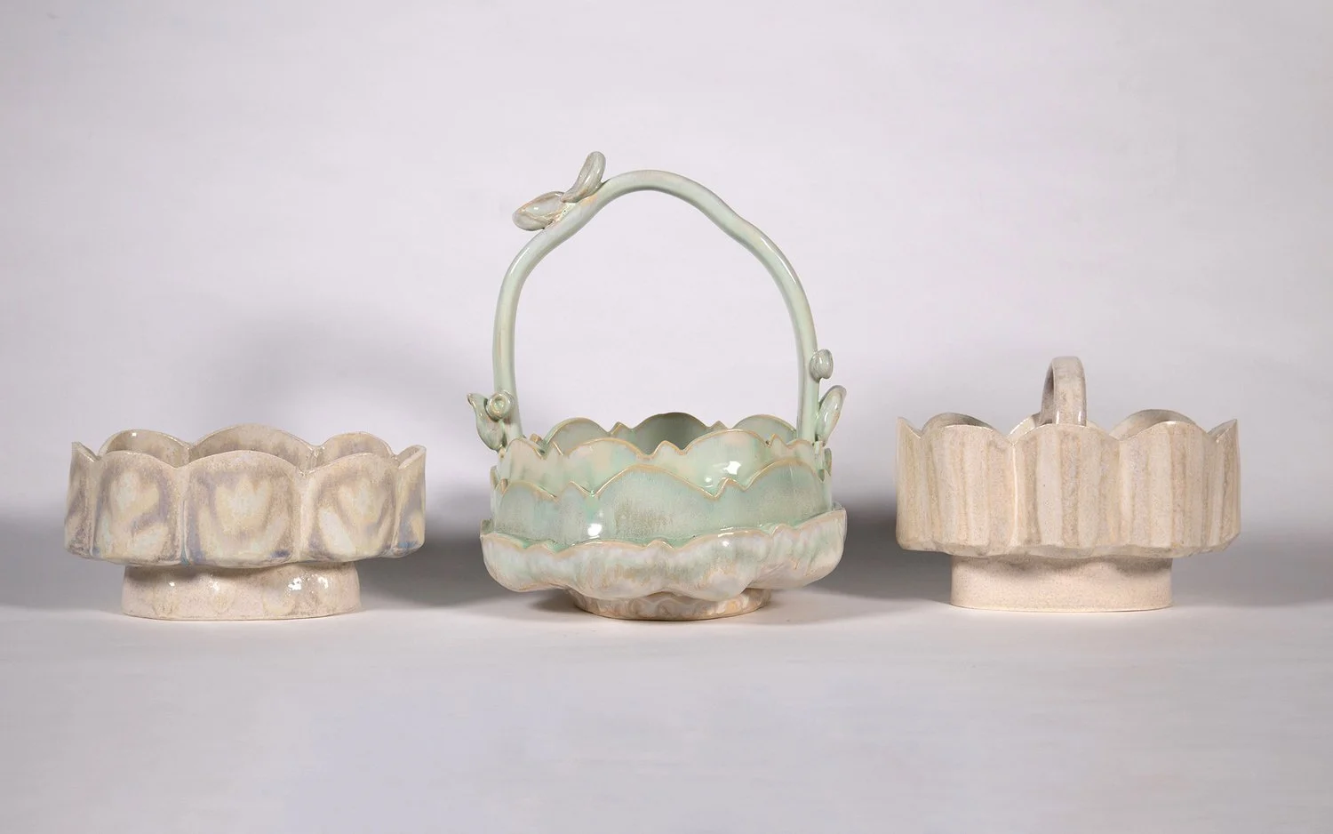 I am crafting softened, abstracted reflections on lived feelings and memories to make decorative vessels - mainly special-occasion functional wares. Using hand building methods like pinching, coiling, and slab building, I practice slow making as a reprieve and attestation to experience. Themes of romanticism through nature and the self are communicated with form and surface through expressions of flora, poetry, stars, love and life. The pieces explored in this semester are a bridge between my own understanding and placed-value, and my notation and translation on these subjects.