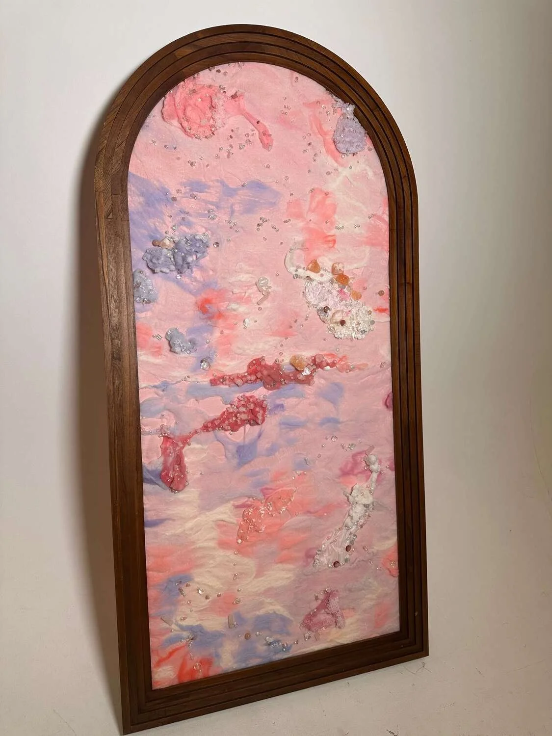 Mirage is engaging in an exploration of texture, color, and material diversity, calling attention to the ways in which natural forms interact with human craft. Inspired by organic forms such as coral and moss, the final piece is a tapestry, measuring 1.82 meters high by 0.91 meters wide. The work incorporates the formation of coral, the growth of moss, and the organic processes that evolve over time. I explore the interplay between soft, flowing textiles and hard crystalline structures, capturing the beauty of natural forms.